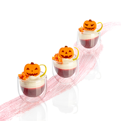 Dýně je sada dekorací z kvalitní bílé čokolády barvené na oranžovou. Výrazná barva a „strašidelný“ potisk umožňují vytvořit originální aranžmá dortů a zákusků s halloweenskou tématikou.